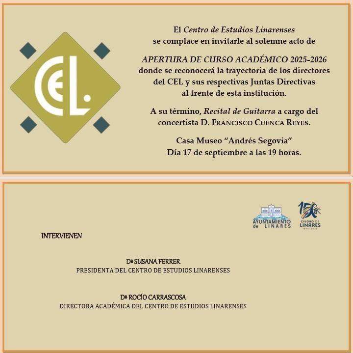 APERTURA DEL CURSO ACADéMICO 2025/26, DEL C.E.L., QUE TENDRá LUGAR EN LA CASA MUSEO ANDRéS SEGOVIA, EL PRóXIMO DíA 17 (MIéRCOLES), DE LOS CORRIENTES, A LAS 19 H. EN DICHO ACTO SE RECONOCERá LA TRAYECTORIA DE LOS/A, HASTA AHORA, DIRECTORES/A DEL C.E.L., ASí COMO A SUS RESPECTIVAS JUNTAS DIRECTIVAS, AL FRENTE DE LA INSTITUCIóN..