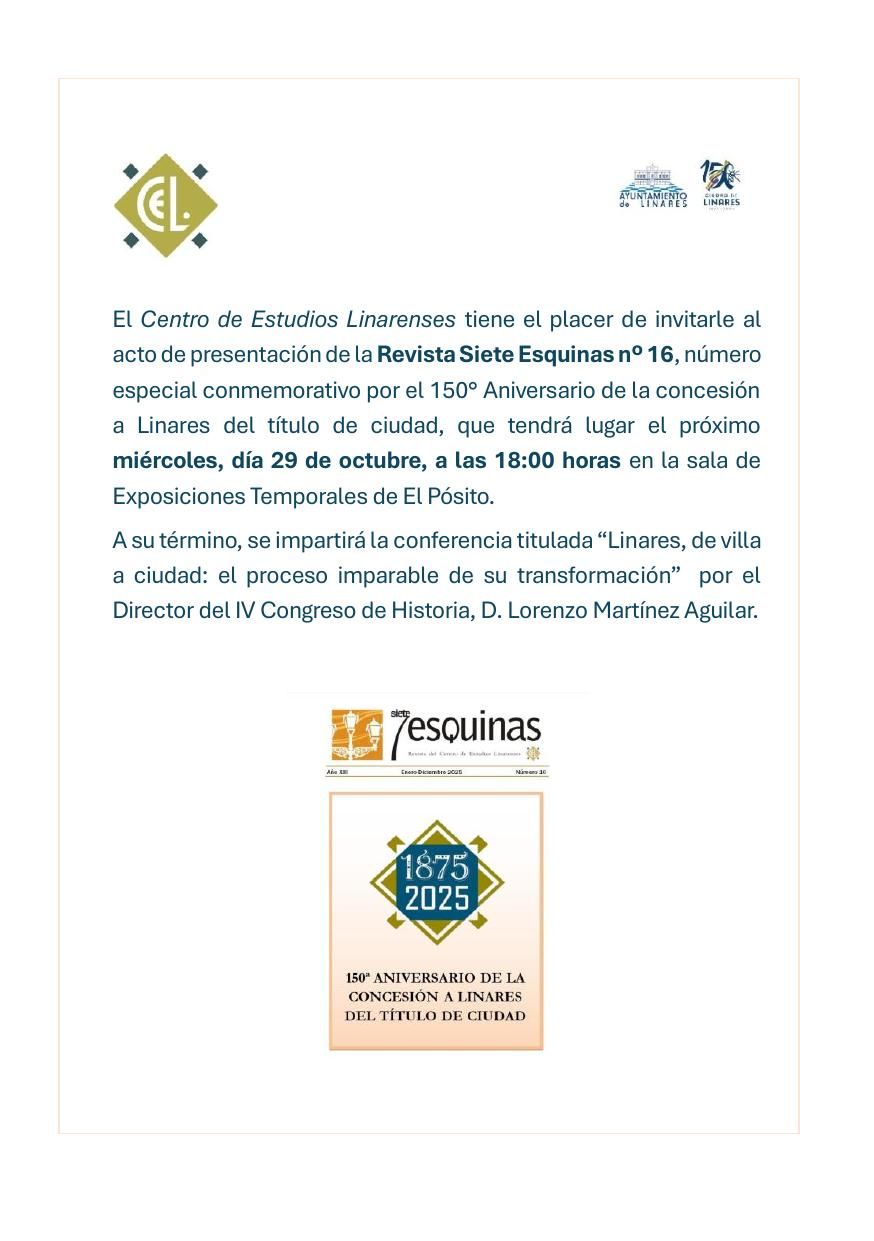 EL CENTRO DE ESTUDIOS LINARENSES, CELEBRARá LA PRESENTACIóN DE LA REVISTA SIETE ESQUINAS NúM. 16, NúMERO ESPECIAL CONMEMORATIVO DEL 150 ANIVERSARIO DE LA CONCESIóN A LINARES DEL TíTULO DE CIUDAD, QUE TENDRá LUGAR EL PRóXIMO DíA 29 DE LOS CORRIENTES (MIéRCOLES), A LAS 18 HORAS, EN LA SALA DE EXPOSICIONES TEMPORALES DE EL PóSITO-MUSEO DE RAPHAEL. A SU TéRMINO, SE IMPARTIRá LA CONFERENCIA TITULADA “LINARES, DE VILLA A CIUDAD: EL PROCESO IMPARABLE DE SU TRANSFORMACIóN”, POR EL DIRECTOR DEL IV CONGRESO DE HISTORIA DE LINARES, D. LORENZO MARTíNEZ AGUILAR.