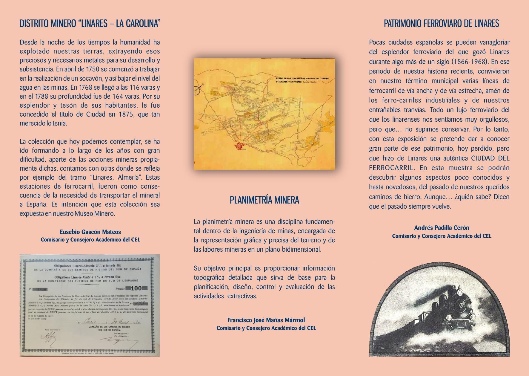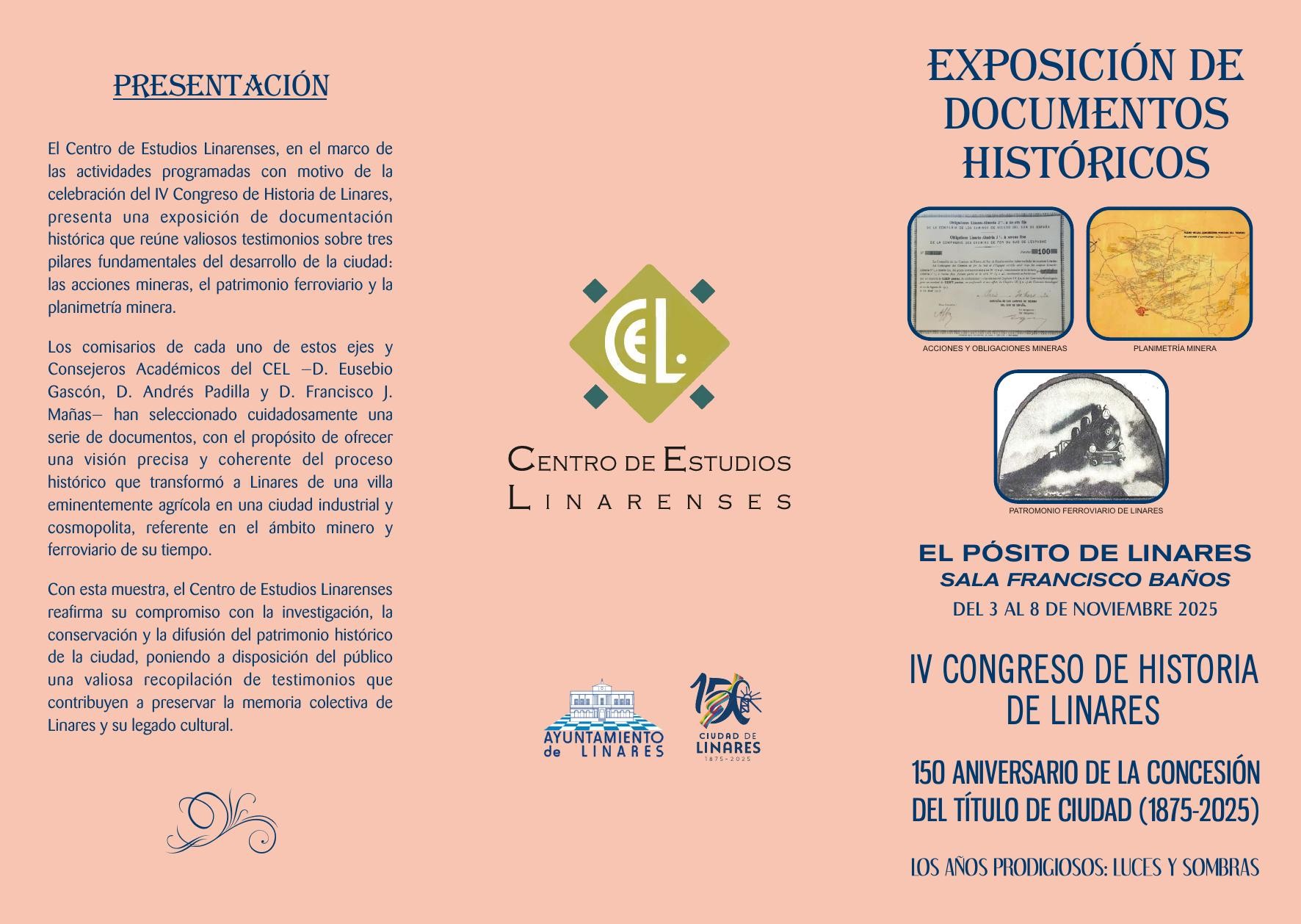 TRíPTICO DE LA EXPOSICIóN DE DOCUMENTOS HISTóRICOS, QUE SE CELEBRARá, DEL 3 AL 8 DE NOVIEMBRE PRóXIMO, EN LA SALA DE EXPOSICIONES FRANCISCO BAñOS DE EL PóSITO-MUSEO DE RAPHAEL, ORGANIZADA POR EL C.E.L., COMO ACTIVIDAD COMPLEMENTARIA AL IV CONGRESO DE HISTORIA DE LINARES.